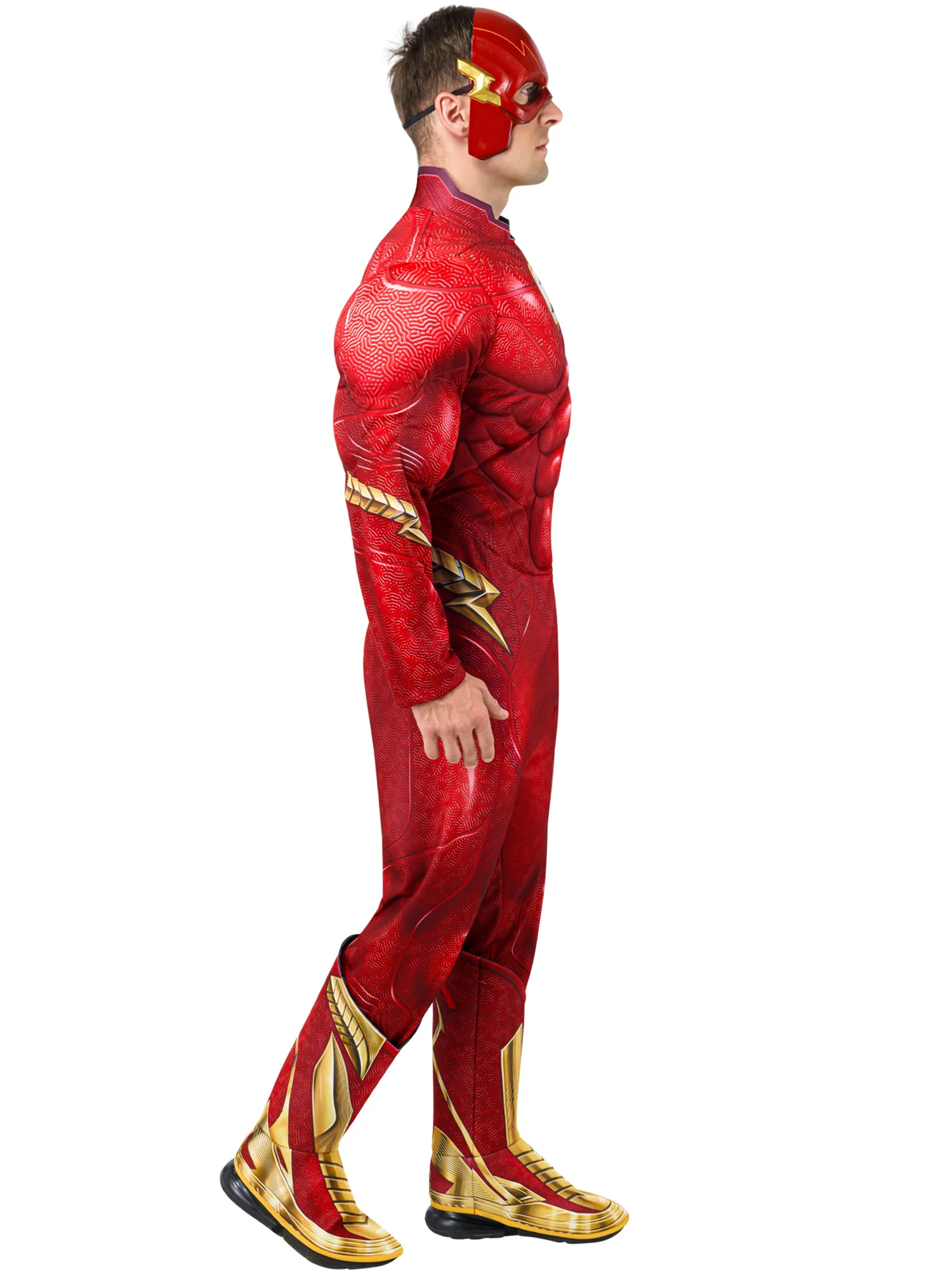 You will be the fastest man alive, Barry Gordon aka The Flash, when you wear our Men's The Flash Movie Flash Muscle Chest Costume - Deluxe! This heroic outfit includes a red padded jumpsuit with gold lightning bolts and attached boot tops, plus a detailed half mask. Look extra buff in this deluxe costume since it's padded to give you some extra last minute muscles. Embrace your inner superhero and gain unimaginable speed in this costume perfect for comic cons and justice-saving costume parties. Get your jumpsuit on, it's time to save the day! Whether you're attending an event or just trick-or-treating, you'll be sure to show off your superpowers in this officially licensed DC Comics product.